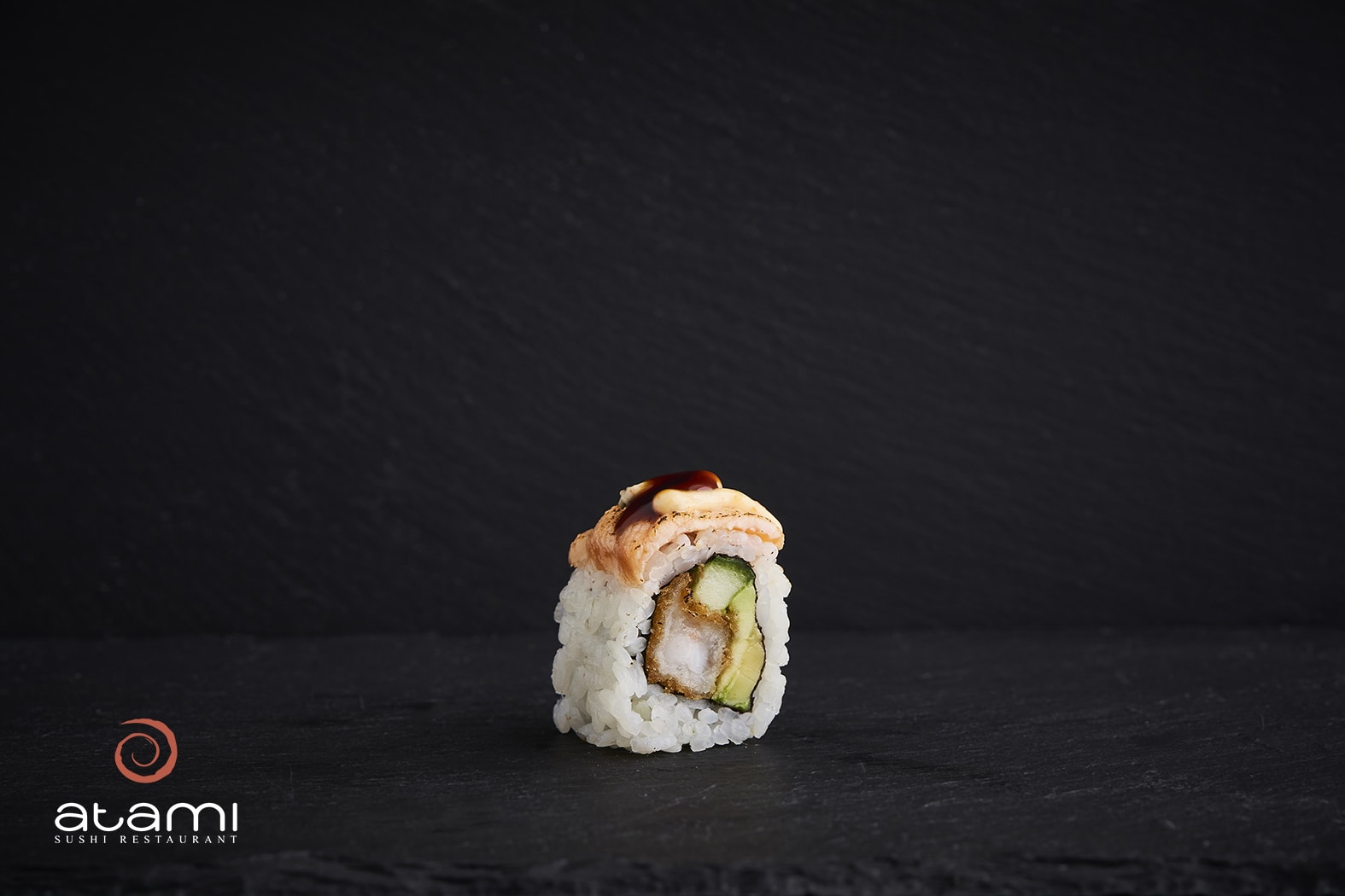 Tempura reje, avocado, agurk. Toppet med laks tataki, spicy mayo og teriyaki.(8 stk.)